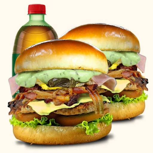 Pão, 2 carnes de 56g, queijo, presunto, ovo, bacon, alface, tomate e cebola caramelizada